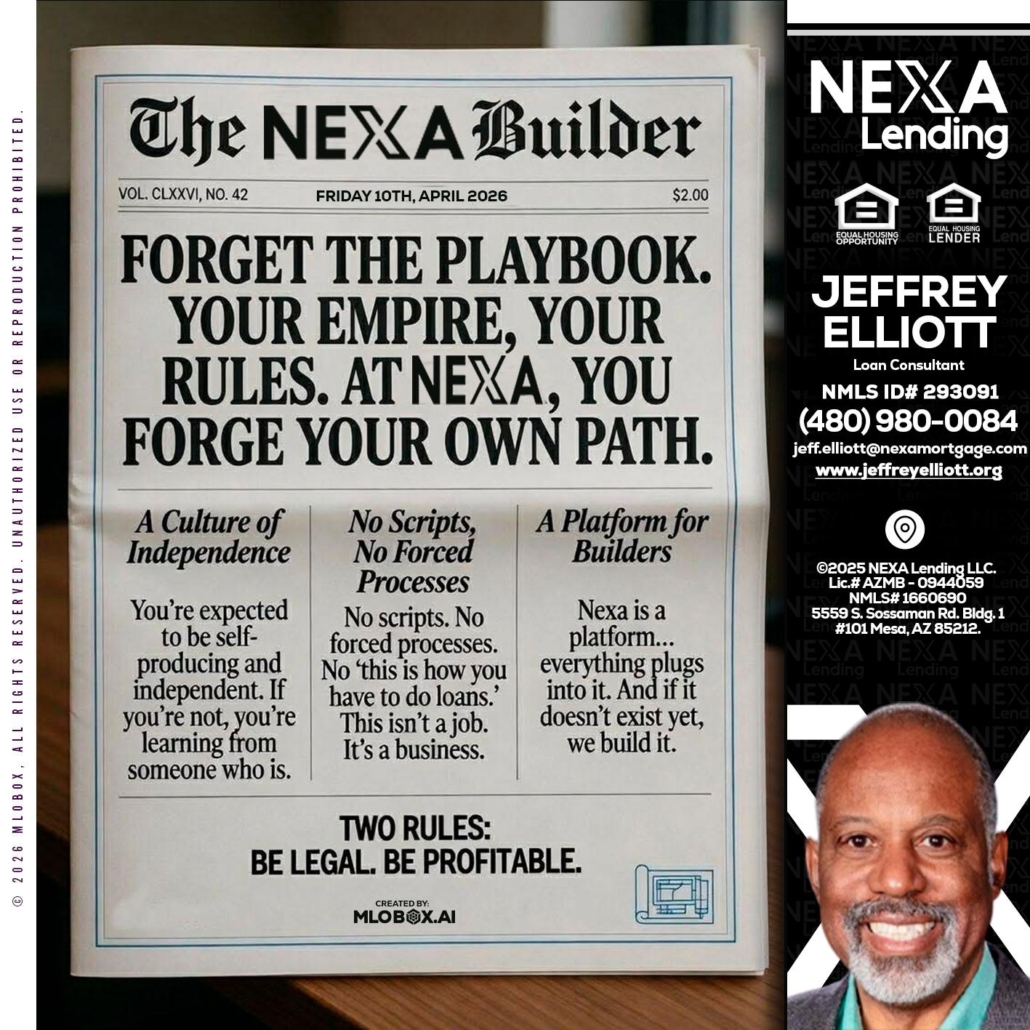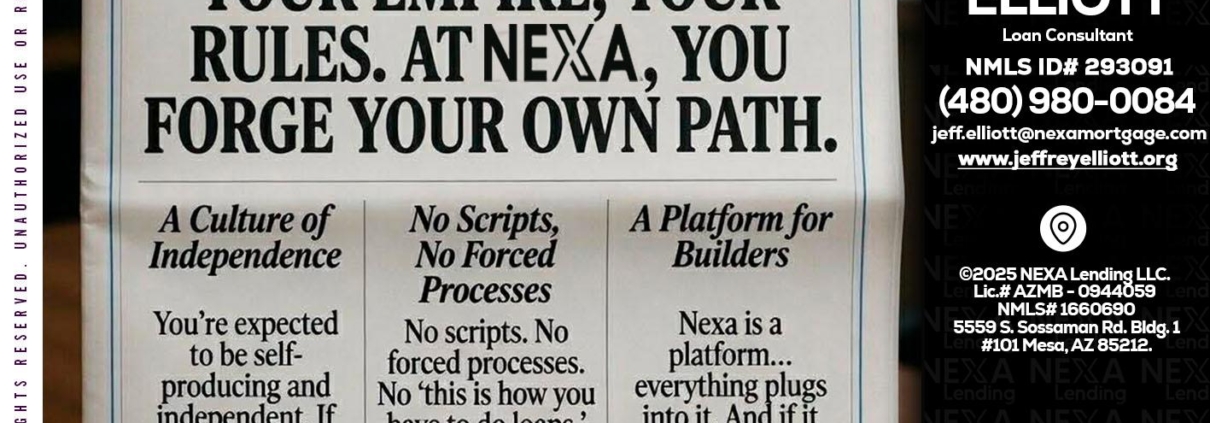 Hi, my name is Jeffrey L. Elliott. I’m a Loan Officer with NEXA Lending LLC., offering personalized mortgage solutions, fast customized quotes, great rates and service with integrity.